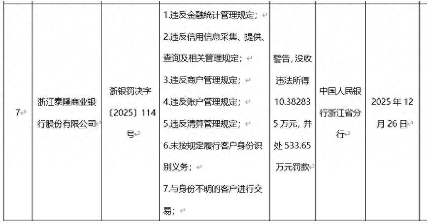 临近2025年末,中国人民银行浙江省分行的一张罚单将浙江泰隆商业银行(下称“泰隆银行”)推上舆论风口——因存在违反金融统计管理规定、未按规定履行客户身份识别义务等八项违规行为,该行被没收违法所得10.38万元,并处以533.65万元罚款。这一处罚金额创下泰隆银行近年纪录。