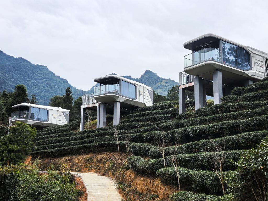 将“茶”字拆开,就是“人在草木间”。近年来,当地在发展产业的同时,积极探索人与自然和谐共生。在鹊鸣春有机茶园里,6座“悬浮”于茶山之上的太空舱民宿成为这里的独特风景。从民宿的落地窗望去,脚下是有机茶园绵延起伏,远处山峦若隐若现。