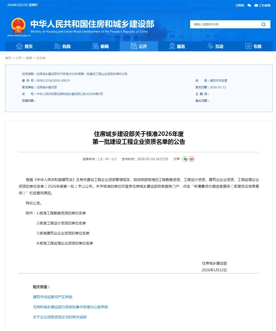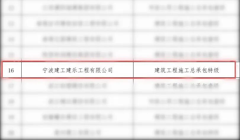 近日,国家住房和城乡建设部发布《住房城乡建设部关于核准2026年度第一批建设工程企业资质名单的公告》,宁波建工股份有限公司全资子公司宁波建工建乐工程有限公司成功取得建筑工程施工总承包特级资质,同步获批工程设计建筑行业(建筑工程、人防工程)甲级资质。
