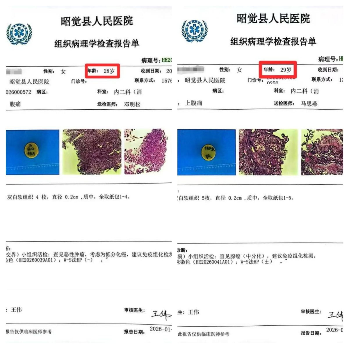 胡骏杰医生目前深度参与昭觉县人民医院消化内科的门诊、内镜及病房诊疗工作。据他介绍,这两名年轻患者均因腹痛就医,经胃镜及病理检查后,不幸被确诊为进展期胃癌。