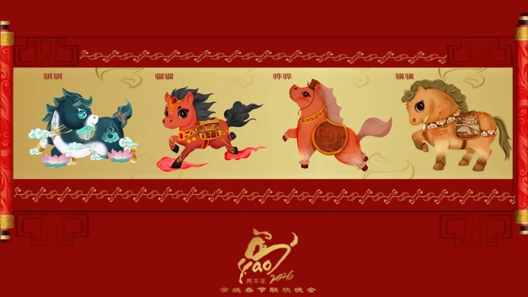 “为了契合马年春晚,我们确定了以‘马’为核心的创作思路。”据创作这组吉祥物的宁波钦昱文创有限公司总经理张晋豪介绍,团队选取“骐、骝、骅、骥”四种古代骏马为原型,寄托奔腾奋进、吉祥圆满的美好寓意。