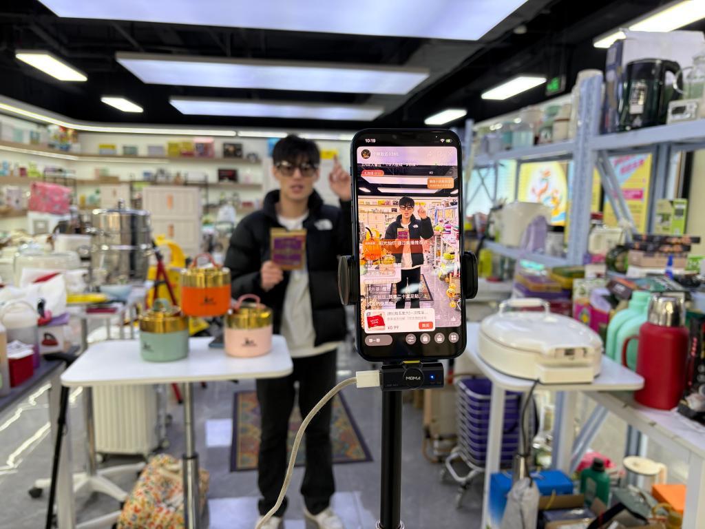 图为一位主播在无锡旺庄科技创新园的大鲤鱼直播基地直播