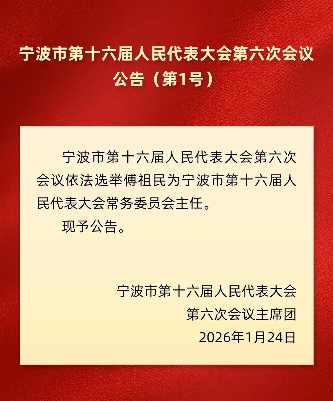 傅祖民当选宁波市第十六届人民代表大会常务委员会主任
