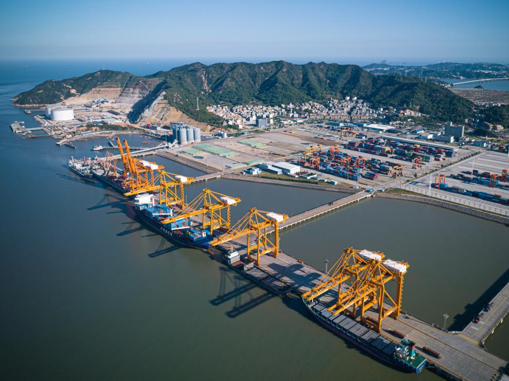 货轮停靠在温州港状元岙集装箱码头卸载集装箱(无人机照片)。新华社记者江汉 摄