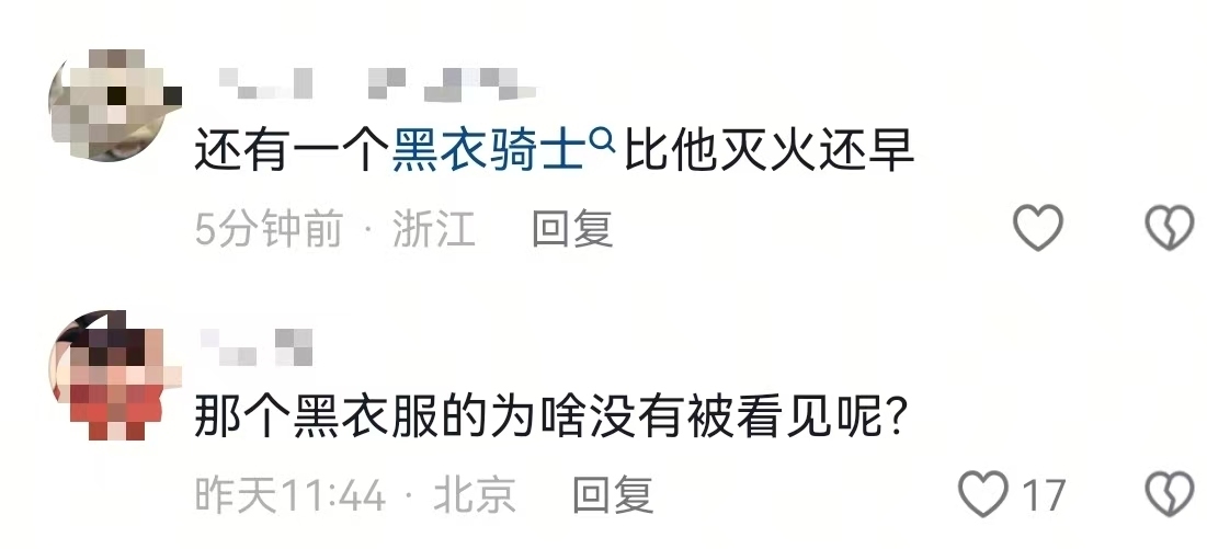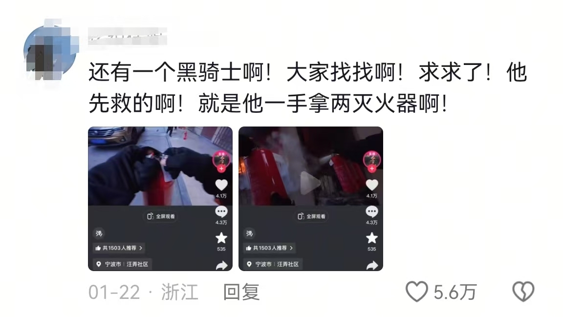 除了冲进火场的小哥杨毅外,细心的网友发现,还有一位身着黑衣戴着头盔的身影比杨毅更早出现在火险现场。由此,大家在为杨毅点赞的同时,也不忘“在线寻人”。