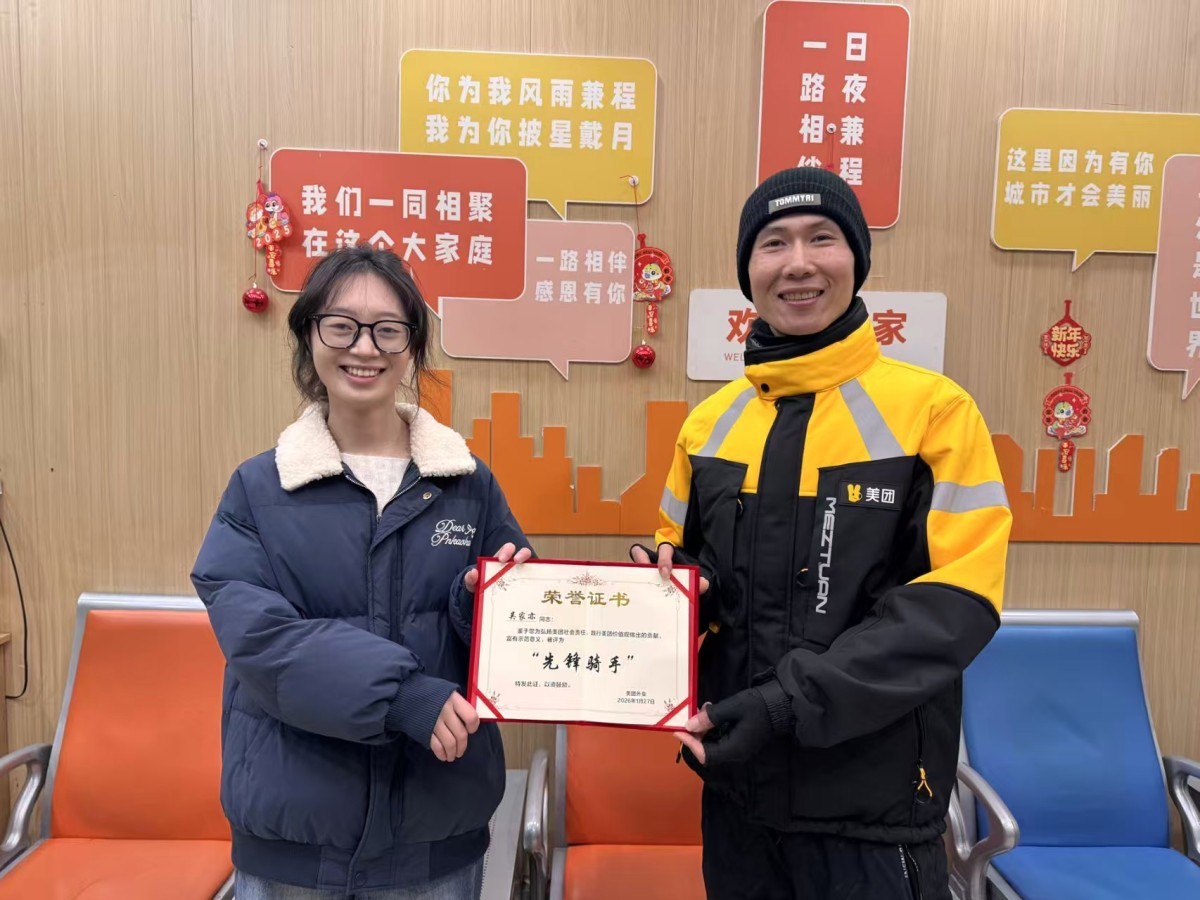美团代表胡女士为吴家亦送上“先锋骑手”证书。记者 黎莉/摄