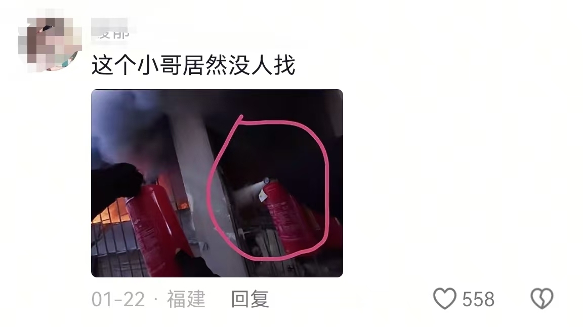 吴家亦一手拿两个灭火器救火的动作被不少网友截图当作寻人“证据”。