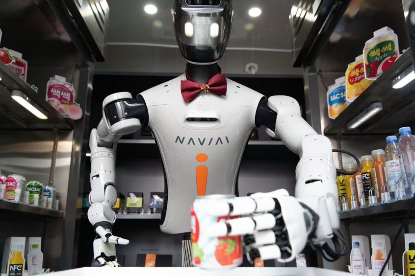 “Hello,我是小卖部主理人小i。”这位打着红色领结的人形机器人吸引了一大批顾客。他一边耐心回答顾客的提问,一边接收指令,抓取递货,服务结束还不忘礼貌鞠躬感谢。浙江人形副总经理许学成表示,工业场景是目前技术落地和市场规模的重点,但展望未来3到5年,服务与家庭场景的市场潜力将更为巨大。“这是我们从工业迈向广阔服务领域的第一步。”他说。
