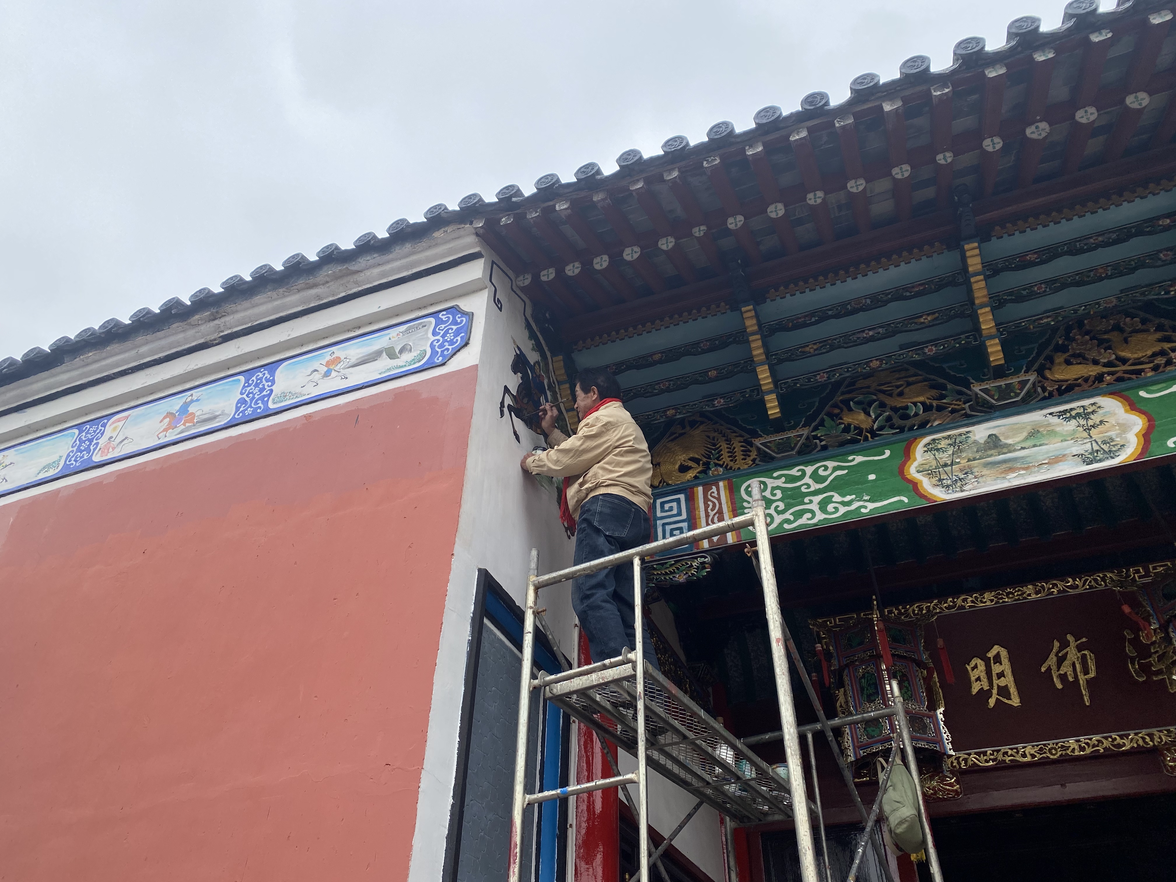 移步至咸祥庙,这座始建于明初、有着600余年历史的古庙宇,本为裴君庙和杨公祠合建而成,承载着当地百姓的祈福心愿,新春期间早已张灯结彩、喜气盎然,时不时有前来祈福的村民。现场,省灰雕非遗代表性传承人朱英度正站在高高的脚手架上,专注绘制张飞骑马的墙绘。今年80周岁的他,擅长古建筑彩绘与灰雕创作,宁波天一阁、天童寺等诸多古建的灰雕作品都出自他之手。一笔一画间,他将张飞的刚正豪迈与骏马的昂扬气势展现得淋漓尽致,既贴合马年主题,也彰显了古建彩绘的非遗魅力。咸祥老街里,盘扣非遗传承人李玲君正专注制作马形盘扣,绸缎翻飞、银针穿梭,一个个精巧的马形盘扣,将马年元素与传统盘扣技艺相融,成为咸祥马年独特的文化符号,古建风韵与非遗匠心交相辉映,尽显传承魅力。