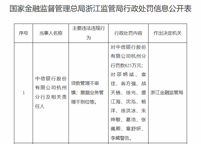 日前,据国家金融监督管理总局网站信息公布,中信银行股份有限公司杭州分行在业务运行中存在管理不审慎等违规行为,国家金融监管部门决定处以625万元罚款,并对相关责任人给于警告处分。