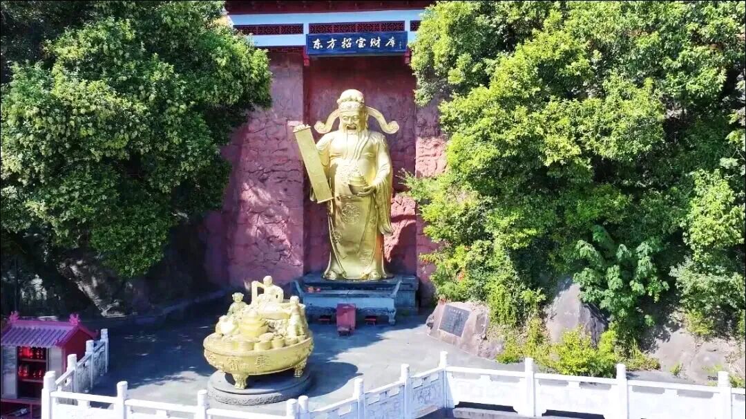 踏入招宝山,目光最先被山巅的“东方招宝财库”牢牢吸引。那尊8.8米高、12吨重的招宝天尊铜像,傲然矗立在天地间,是东南亚最高的露天财神铜像,甫一相见,便让人感受到扑面而来的祥瑞之气。