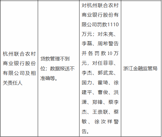 据国家金融监督管理总局网站信息公布,杭州联合农村商业银行股份有限公司运行中,存在贷款管理不到位等违规行为,被国家金融监督管理部门处以罚款1110万元,并对相关责任人作出相应处罚与警告。