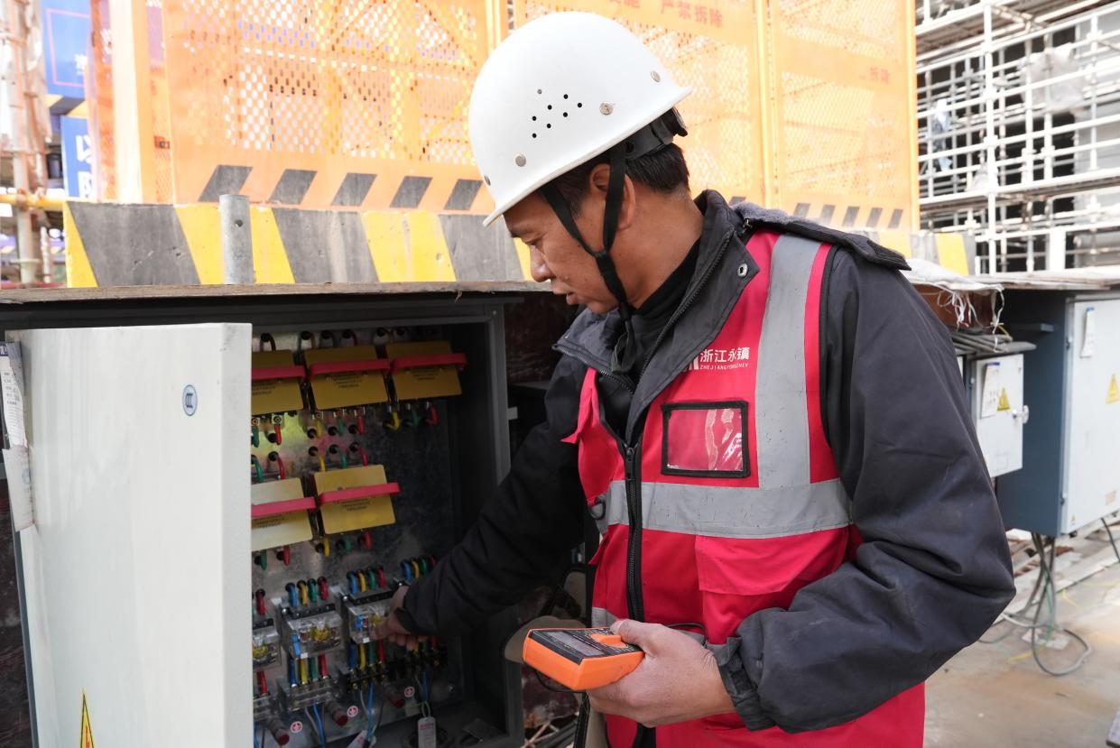 清晨五点多,天还未亮透,电工郑可涨已背上他那磨得起球的工具包到达施工现场。作为项目上负责消防安全与电力安全的专职人员,上工日他几乎都是最早抵达现场的那一批。从逐一测试电箱、电线、用电设备是否安全,到检查消防栓是否完好,这些看似重复的日常工作,却需要始终如一的细致与专注。