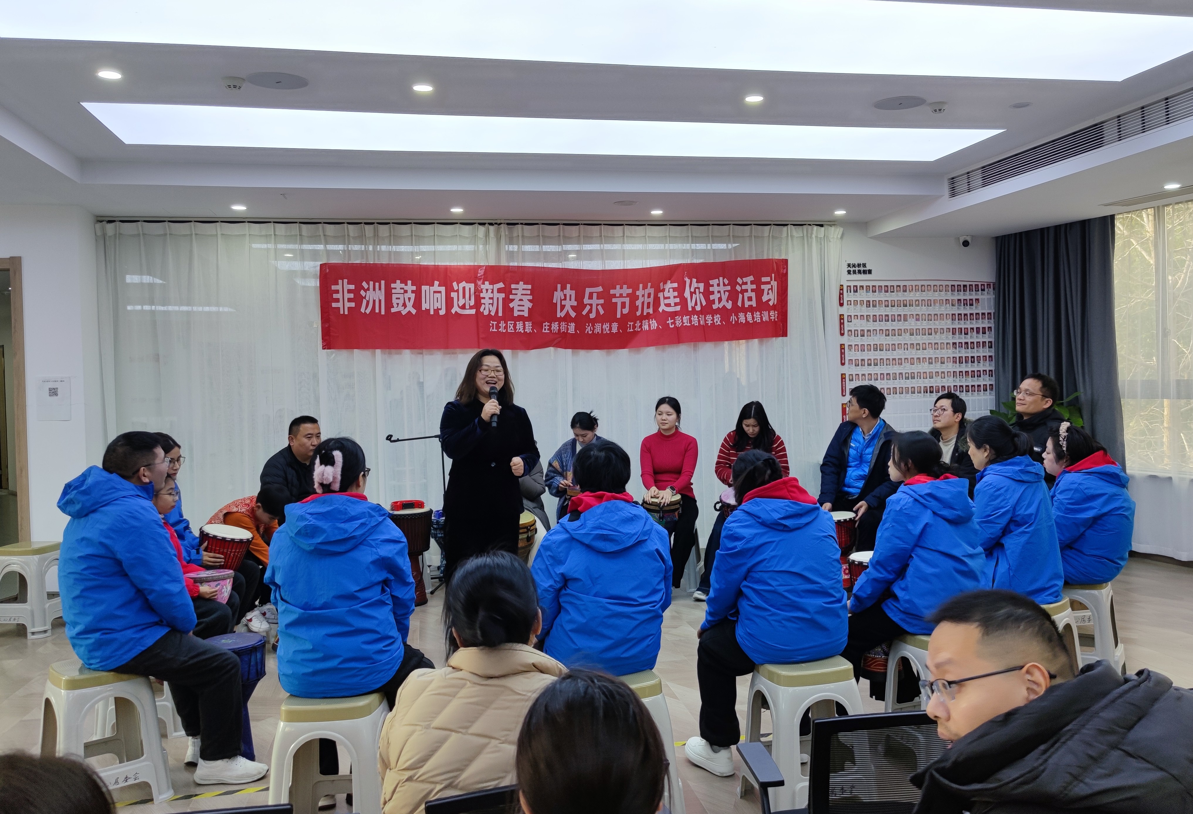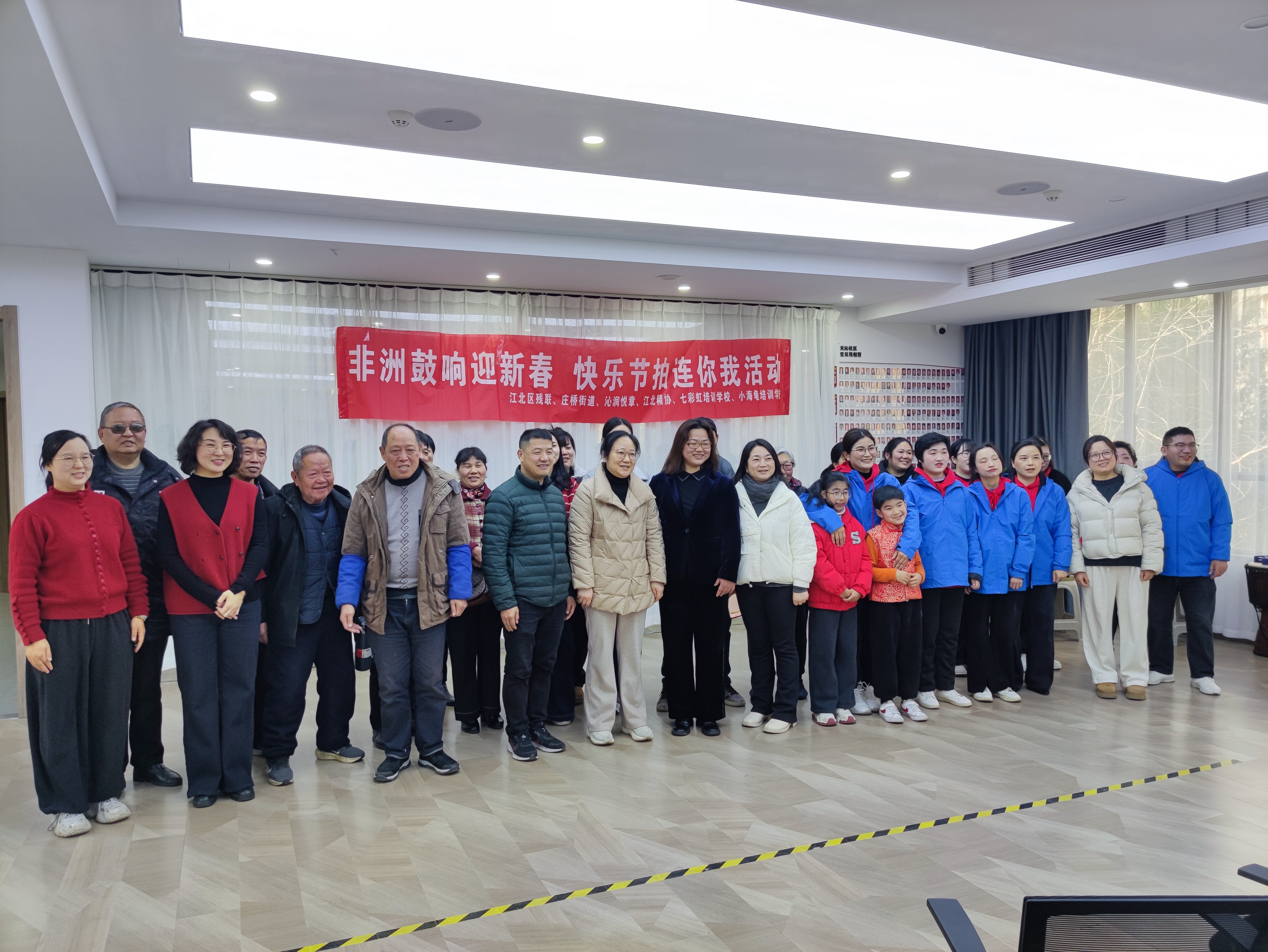 近日,一阵阵节奏鲜明、充满活力的非洲鼓声,从江北区庄桥街道天沁未来社区的幸福学堂中传出,激昂又欢快。这是“精灵”鼓社为迎接新春举办的“非洲鼓响迎新春 快乐节拍连你我”社区专场演出现场。网格居民们在鼓点的引领下,共同沉浸于音乐的共鸣与节日的喜悦之中。