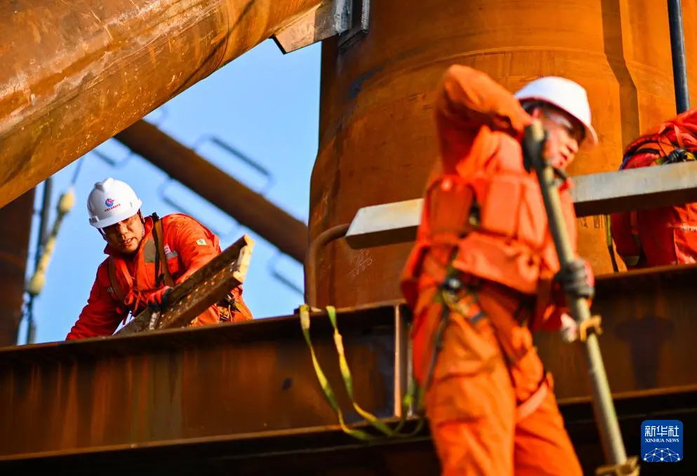 2月13日,渤中26-6油田开发项目(二期)导管架在下水安装(无人机照片)。新华社发(杜鹏辉摄)