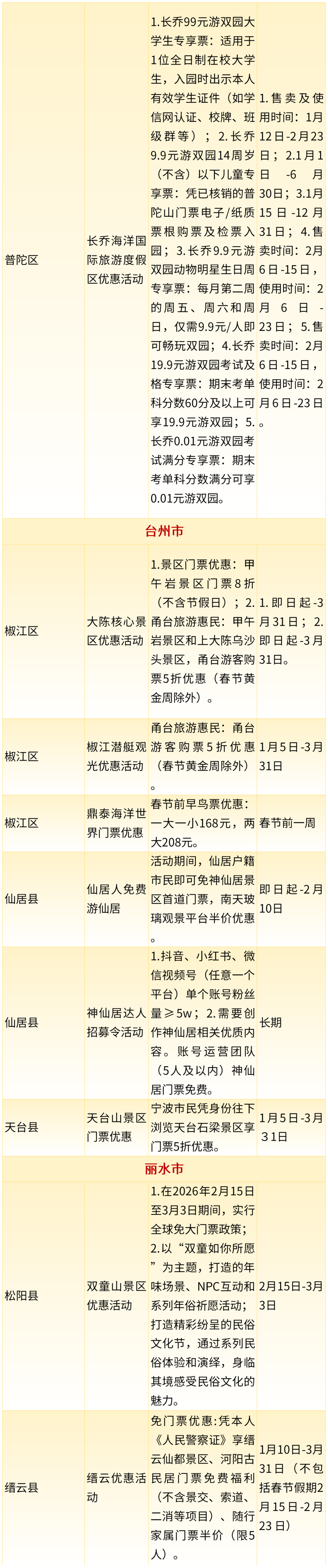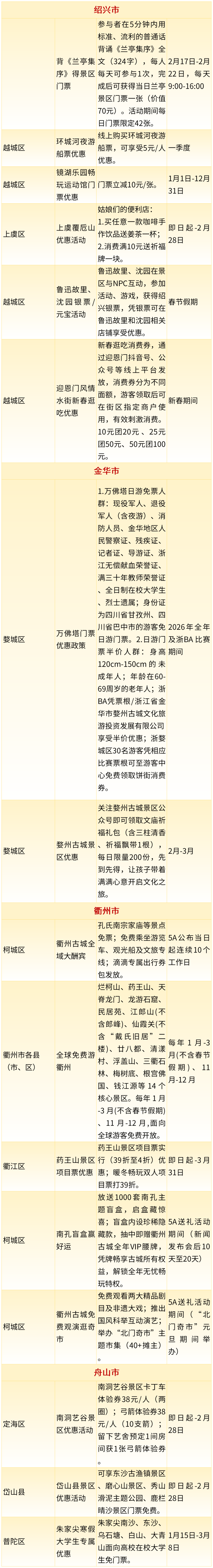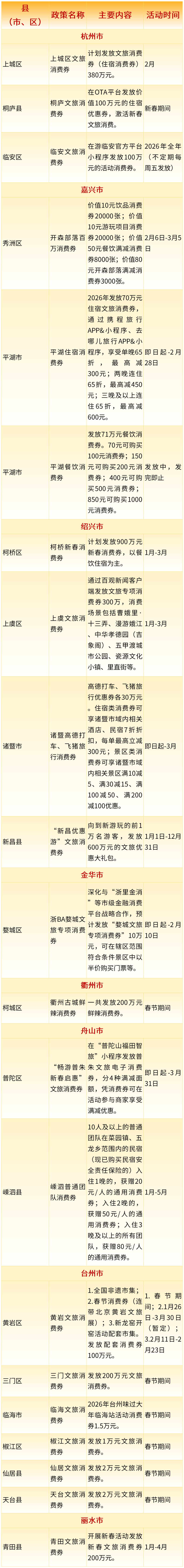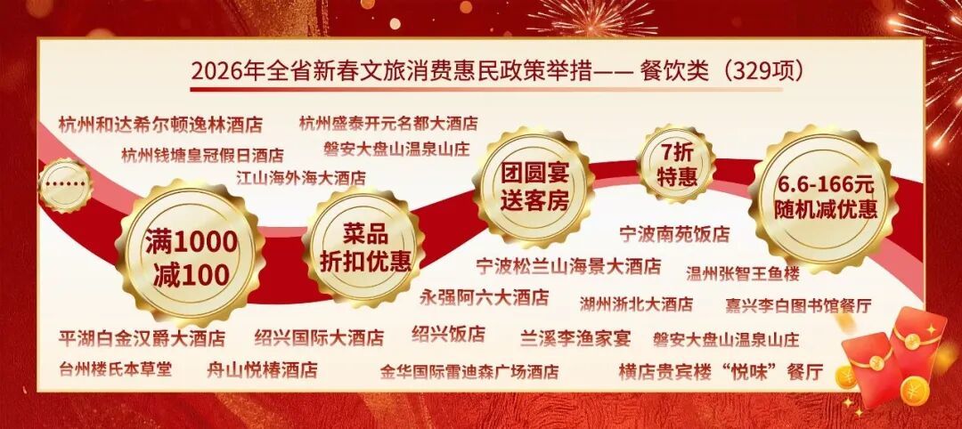 2026年浙江省新春文旅消费惠民政策来了!其中,消费券惠民举措22项,统筹发放消费券3473.5万元,景区类惠民举措56项,餐饮类惠民举措329项,住宿类惠民举措76项,赛事类惠民举措12项,商圈类惠民举措16项,一起来看~