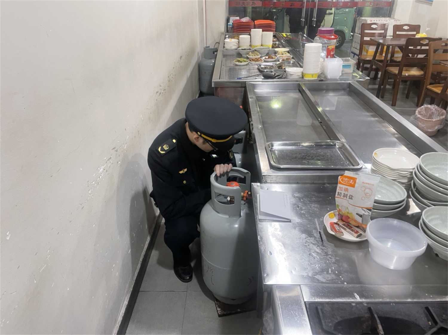 北仑区戚家山综合行政执法中队深入餐饮店后厨,手持检查清单,对气瓶实名制、软管使用、报警器安装等情况进行细致“体检”。在一家早餐店,执法人员发现气瓶被违法加热,立即制止并严肃批评教育。节日期间,已累计完成100余家餐饮店动态检查,确保燃气安全隐患“即查即改”。