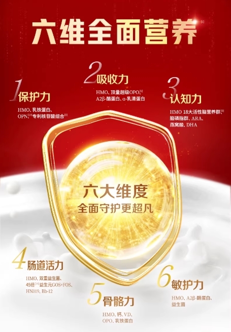 珍护铂萃坚守五重新鲜优质基底,传承金领冠「六位一体」科学配方体系,精准匹配宝宝成长营养需求,全方位加持保护力、吸收力、肠道活力、骨骼力、敏护力、认知力,助力宝宝多维成长。