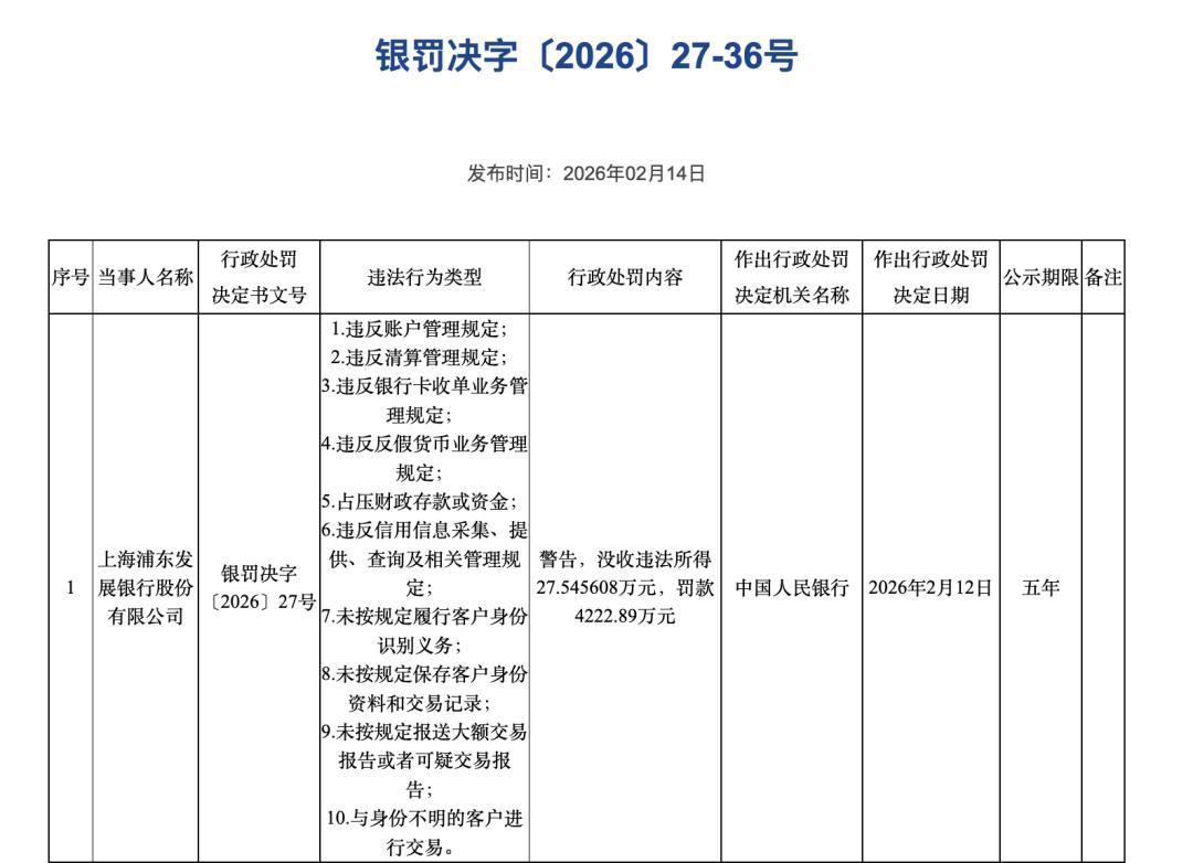 浦发银行被警告并没收违法所得27.545608万元,罚款4222.89万元。