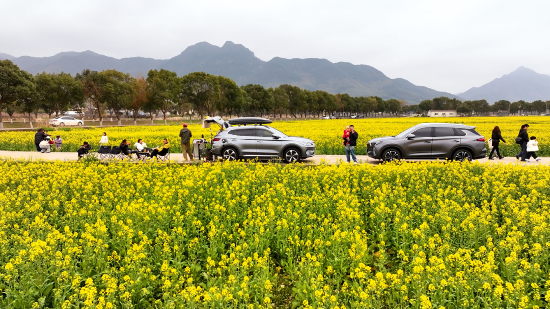 花海旁的后备箱咖啡车前,游客排起小队,一杯杯热饮为春日踏青增添暖意,乡村“微旅游”氛围十足。