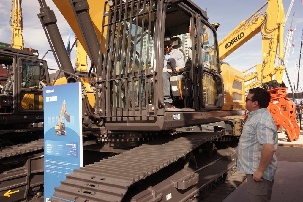 3月4日,在美国拉斯维加斯工程机械展上,参观者体验徐工集团的智能化设备。新华社发(曾慧摄)