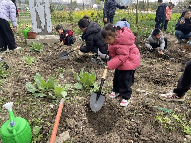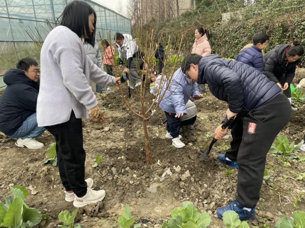在随后的植树实践环节,家长与孩子们通力协作,挥锹挖坑、扶苗培土、提水浇灌,每一个步骤都认真细致、有模有样。孩子们的小手紧握铁锹,虽然动作略显生涩,但专注的神情令人动容。在大家的共同努力下,一棵棵梨树、桃树、橘子树等果树苗在春风中傲然挺立,为原本空旷的田园增添了勃勃生机。一位参与活动的家长感慨道:“和孩子一起种下这棵树,不仅是种下一份希望,更是让他懂得保护环境要从身边小事做起。”