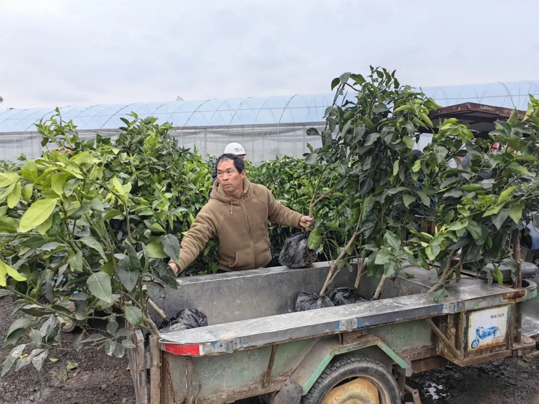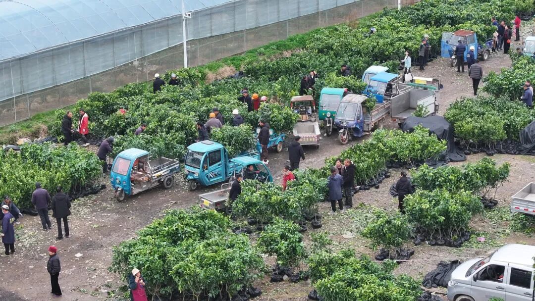 一大早,定塘镇综合市场旁的苗木市场已是人头攒动。红美人、象山青、大分、宫川等不同品种的柑橘苗木分门别类、整齐排列。苗木摊主热情介绍各品种优势,橘农们则蹲在苗前仔细挑选,比对根系、打量枝干。前来采购的以定塘、晓塘、鹤浦等南片乡镇橘农为主,也不乏专程赶来的外地客商。晓塘乡种植户干岳峰正将选好的苗木装车:“去年冻死了七八十株,今天来补五六十株。本地苗质量好,象山红美人名气响,还是本地的放心。”
