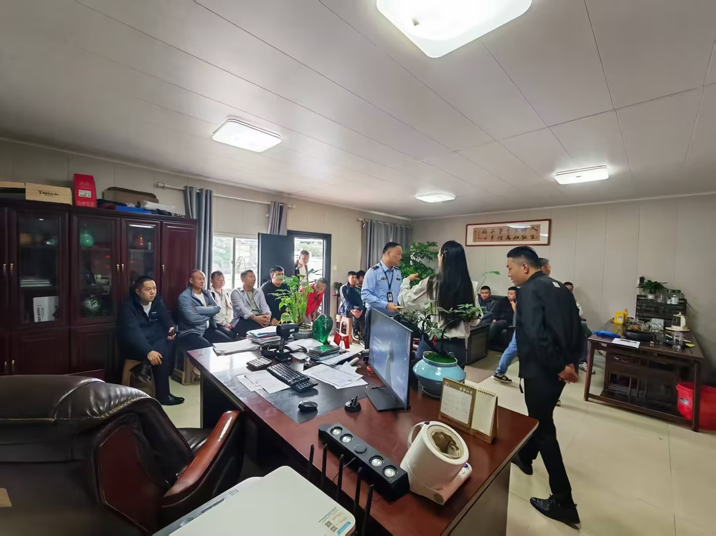图为工作人员在办公室内向多位司机现场讲解保险条款