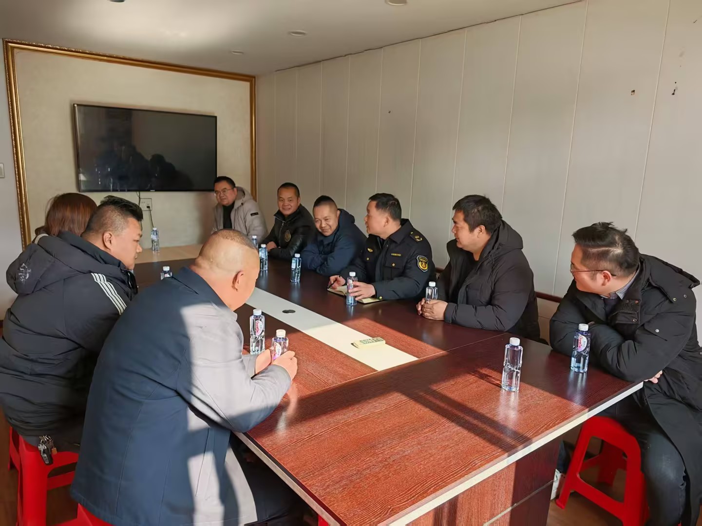 图为宣导人员在会议室与司机代表座谈交流