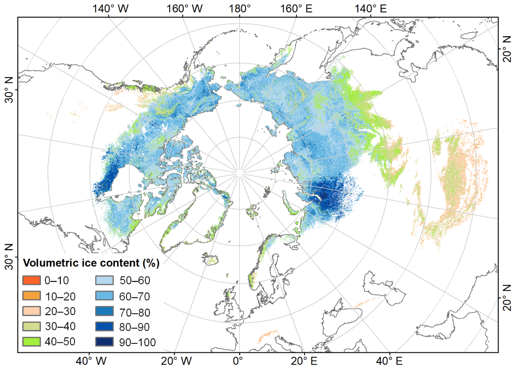 图为北半球多年冻土上限以下5米深度体积含冰量空间分布。(受访者供图)
