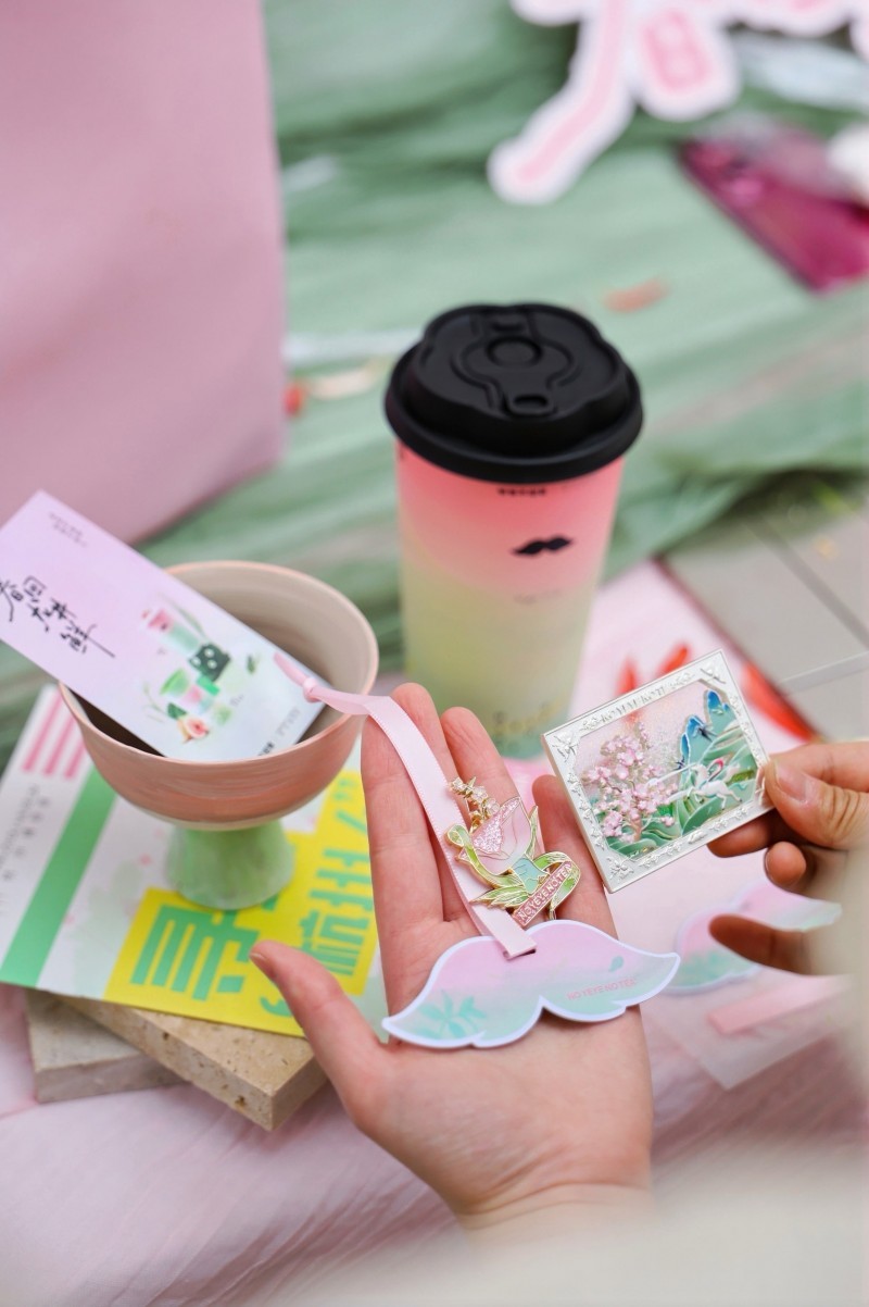 这次联名还把文物美学做成了超吸睛的文创周边。春回龙井主题纸杯、杯贴、纸袋,随手一拍都是朋友圈大片,联名小粉杯徽章更是成了社交媒体平台的“硬通货”;浙江限定的【春山境】流沙冰箱贴更是颜值封神,浮雕 + 流沙工艺让江南茶园跃然眼前,轻晃一下,流沙漫过茶田,仿佛拨开云雾见春山,妥妥的春日伴手礼天花板。