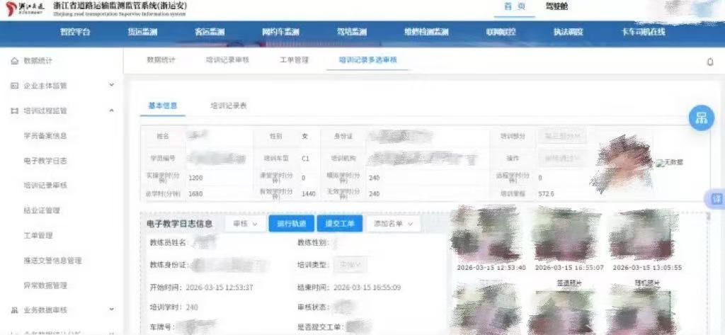 近日,镇海区交通运输执法人员通过浙江省道路运输监测监管系统在对驾校上传学时数据开展日常检查时发现,3月11日11时59分至20时30分,浙B9**8学教练车培训期间,系统刷卡学员与实际操作学员并非同一人,数据与实际培训情况严重“对不上号”。面对这一明显异常,执法人员立即固定证据,展开问询。在确凿的证据面前,驾校负责人最终承认了违规填报学时、弄虚作假的事实。