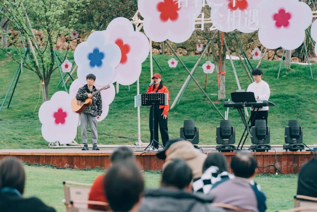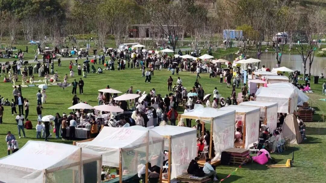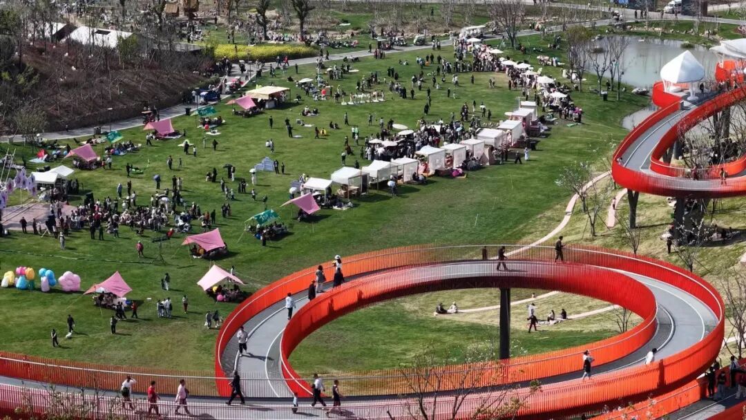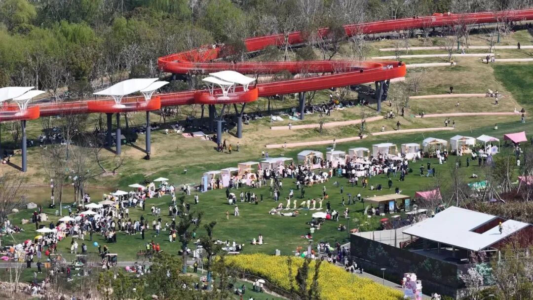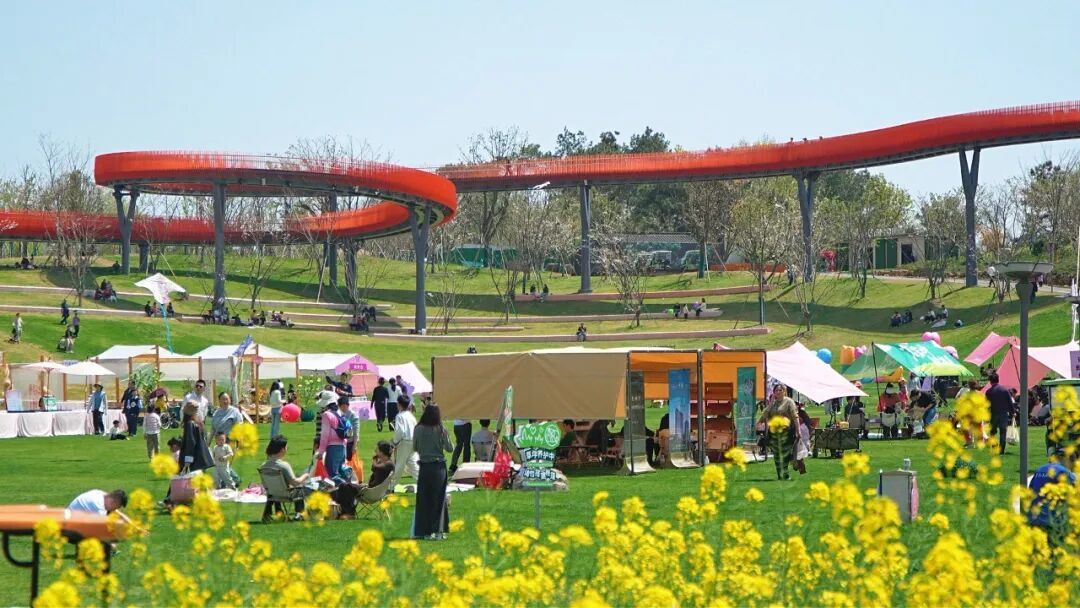 时值三月末,樱花、油菜花等正值盛放期,沿3.9公里生态廊道漫步,可见各种鲜花缀满枝头,如雪似霞。市集摊位与烂漫花海相映成趣,游人穿梭拍照,孩童嬉笑追逐,春意盎然。