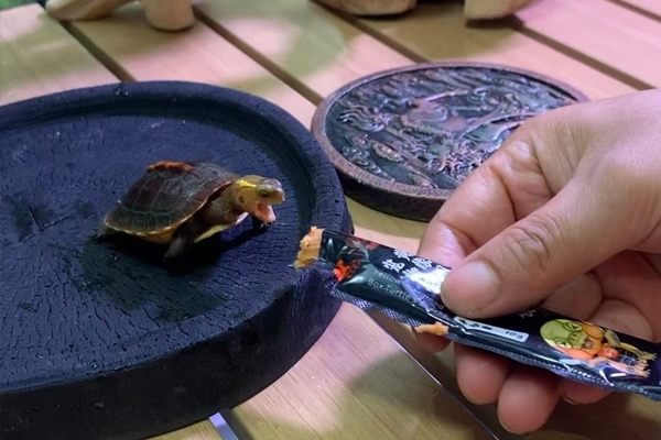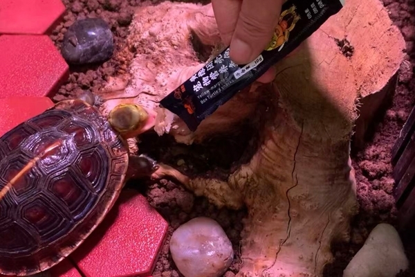 信任建立后,开始加入 “信号引导”,让龟苗把 “特定动作 + 声音” 和 “食物奖励” 绑定:投喂前,轻敲饲养箱边缘 3 下(固定声音信号),再轻声喊它的名字(比如 “小缘”),然后拿出营养条在箱外晃一晃(视觉信号);依然用挤出营养条放在食盘里,但会停留 5 秒再松手,让龟苗看到 “食物来自你的手”;效果:第 4 天,只要听到敲击声,龟苗就会从腐殖土里钻出来,直奔食盘方向;第 5 天,看到我拿着营养条靠近,就会主动爬过来,甚至会用前爪扒拉食盘,“认人” 信号明显。