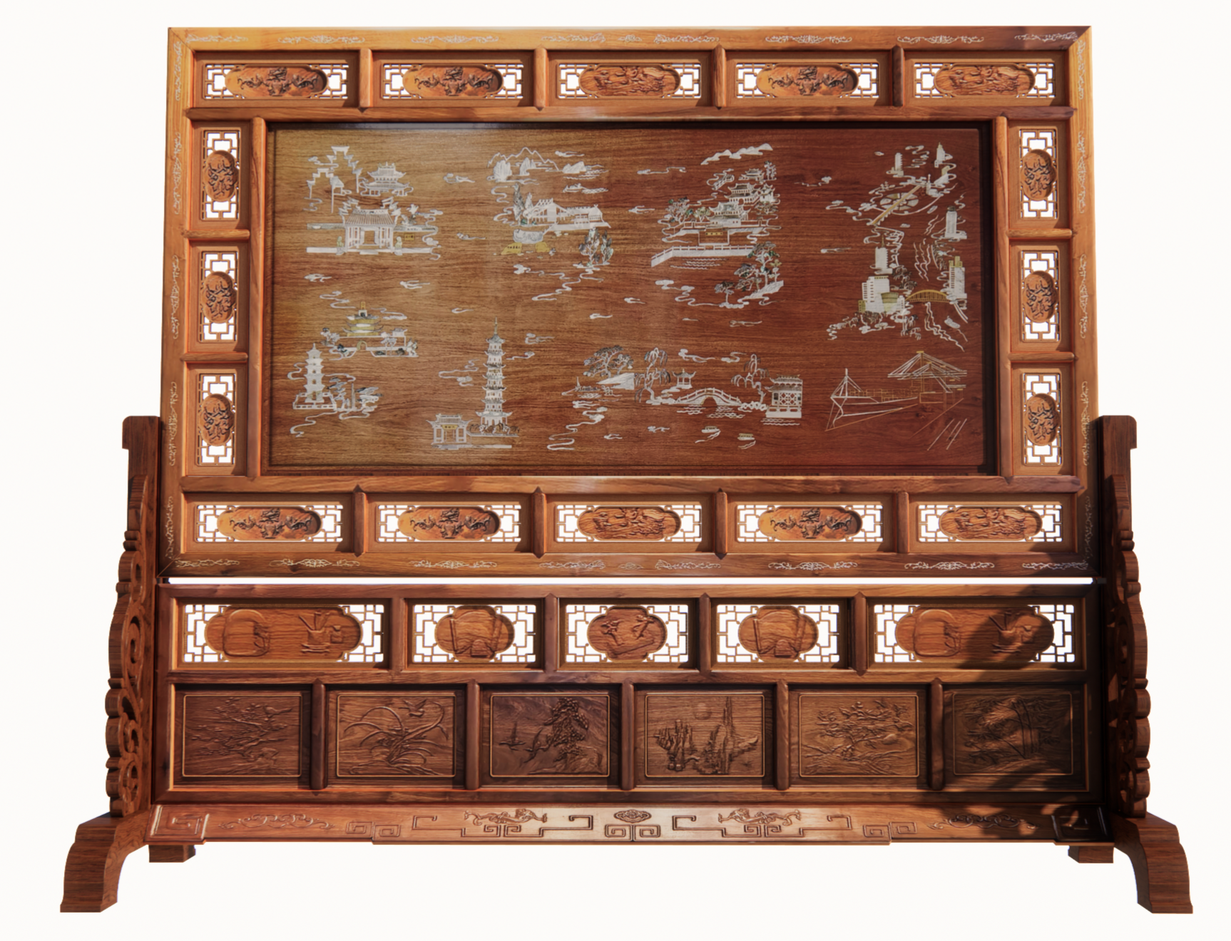 屏风设计兼具地域特色与国际视野,画面内容层次丰富、意蕴深远。正面精心镶嵌宁波十大风景图,将天一阁的书香文脉、宁波港的港通天下盛景等城市标志性景观一一呈现。透过细腻的镶嵌工艺,天一阁千年藏书的文化底蕴跃然眼前,古老藏书楼承载的城市文化记忆被生动诠释;波光粼粼的海面、穿梭往来的巨轮、林立的吊车与堆积的集装箱,直观展现出宁波港口的繁忙与活力,让“港通天下”的城市名片更加鲜活。同时,作为宁波市花的茶花图案栩栩如生地点缀其间,花瓣细腻、色彩明艳,既增添了作品的自然美感,又以茶花繁荣美好的寓意,彰显宁波朝气蓬勃的城市气质。