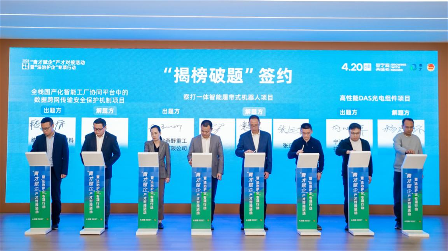 “怎样实现机器人内部核心安全稳定工作?”“日常如何开展精准巡检”“新的隔热材料能否赋能更多应用场景?”……在“技术链企”篇章,一场别开生面的“揭榜破题”访谈精彩上演。宁波奔野重工、善德电子、葆润应用材料、帕瓦莱斯智能科技企业代表围绕“察打一体智能消防机器人”技术攻关等需求展开探讨,现场气氛热烈,引得台下观众频频点头。这场别开生面的“技术相亲会”,深刻彰显了“企业出题、人才解题、政府助题”的协同创新机制,让众多企业代表深受启发。随后的“揭榜破题”签约仪式将现场气氛推向高潮,一份份产学研深度融合的协议标志着从实验室到生产线的创新链条正在奉化加速贯通。