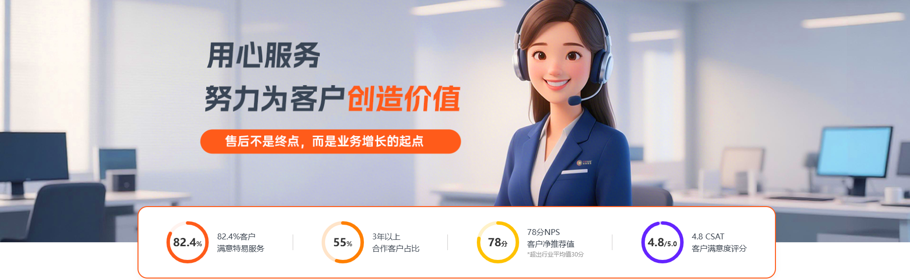 82.4% 客户对特易整体服务表示满意,NPS 净推荐值 78 分,高出行业平均 30 分以上。